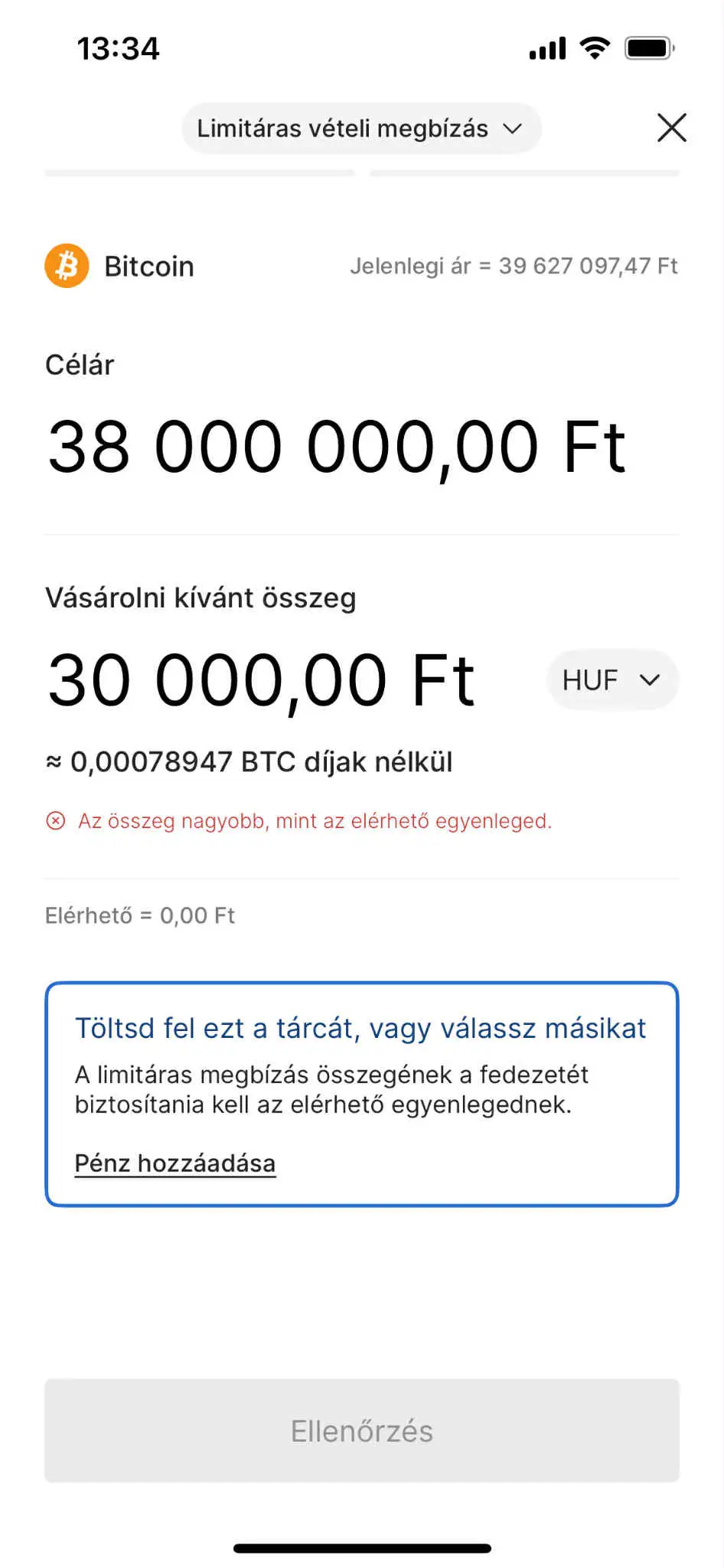 Majd add meg, mennyiért szeretnél vásárolni (pl. 30 000 Ft). A rendszer automatikusan jelzi, hogy mennyi lesz a díj és mennyi BTC-t kapsz.