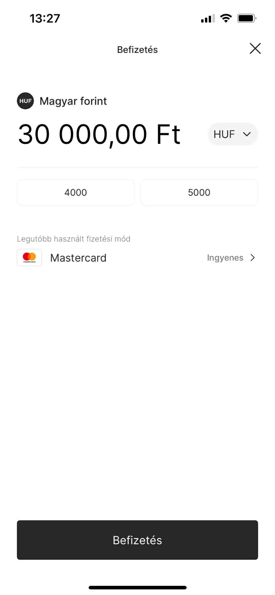 Forint feltöltése: Írd be az összeget, például 30 000 Ft, és erősítsd meg a tranzakciót. Ez a feltöltés díjmentes.